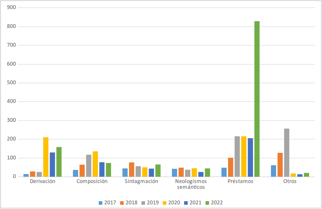 Publicaciones Fernández-Silva, Sabela., Villena, Belén., Ramírez, Maximiliano. (En prensa). Lawen con Newen: la contribución del mapudungún a la neología del español de Chile. En Pozzi, M. (ed.), Reflexiones y actualidad neológica en el español de América y España. El Colegio de México, México. Ramírez, Maximiliano. (2023). Relación entre procedimiento de formación y sentimiento de neología: una aproximación desde la neología experimental. Tesis de magíster. Pontificia Universidad Católica de Valparaíso. Fernández-Silva, Sabela (2022). La variación geográfica de la neología en español y su representación lexicográfica. En: Judit Freixa, Sergi Torner y Elisenda Bernal (Eds.) La neología del español: del uso al diccionario. (pp. 259-282). Madrid: Iberoamericana / Vervuert. ISBN: 978-84-9192-268-1 Garrido, Sofía. (2022). La neología terminológica asociada al no binarismo de género. Tesis de licenciatura. Pontificia Universidad Católica de Valparaíso. Villena, Belén; Cabré, María Teresa y Fernández-Silva, Sabela (2019). Formación de nombres en mapudungún: productividad, genuinidad y planificación. Revista Signos, 52(100), 615-638. Cañete, Paola; Fernández-Silva, Sabela & Villena, Belén (2016). La difusión de la terminología en la prensa escrita: un acercamiento a través de la neología de El País. En: Observatori de neologia (Ed.) Mots d’avui, mots de demà. (pp. 97-114). Barcelona: IULA-Universitat Pompeu Fabra. Koza, Walter & Martínez, Ricardo (2016). Generación automática de definiciones mediante explicitación. Una aplicación a los neologismos del dominio médico. Panace@, XVII(44), 133-143. Cañete, Paola; Fernández-Silva, Sabela & Janer, Francina (2015) La neologia per composició culta. En: Freixa, Judit; Bernal, Elisenda; Cabré, M. Teresa. (eds.) La neologia lèxica catalana. (pp. 53-69). Barcelona: Institut d’Estudis Catalans. Participaciones en eventos científicos XXIII Congreso internacional de la Sociedad Chilena de Lingüística: El lenguaje como espacio de (re)encuentro, Santiago de Chile, 25 de mayo del 2023. “Relación entre procedimiento de formación y sentimiento neológico: una aproximación desde tiempos de respuesta.”, Maximiliano Ramírez. II Seminario Internacional de Neología: Diálogos interdisciplinares de la Neología, Viña del Mar, 18 de noviembre de 2022. “El mapuzugun en el ámbito jurídico. Estrategias de creación de neología terminológica”. Belén Villena, Sabela Fernández Silva. II Seminario Internacional de Neología: Diálogos interdisciplinares de la Neología, Viña del Mar, 18 de noviembre de 2022. “Relación entre procedimiento de formación y sentimiento neológico: una aproximación desde la neología experimental”, Maximiliano Ramírez. II Encuentro Internacional Interculturalidad y reconocimiento. Revitalización del conocimiento indígena en la pedagogía Intercultural: Enseñanza, práctica y lengua. Departamento de Estudios Humanísticos, UTFSM y Universidad Católica de Temuco. 26 y 27 de mayo de 2022. “Wigka ñi wirikon zugu: Técnicas de traducción de términos del ámbito jurídico chileno al mapuzugun”. Belén Villena, Sabela Fernández-Silva. I Congreso Nacional de Estudiantes de Postgrado en Lingüística en Chile, “La investigación Lingüística en Tiempos de Pandemia”, Santiago de Chile, 3-5 de noviembre de 2021. “La polisemia regular acción/efecto en los neologismos por derivación en el periodo 2003-2020”, Maximiliano Ramírez. JINEO: Jornada de investigación en neología, Instituto de Literatura y Ciencias del Lenguaje-PUCV, 14 de diciembre de 2018. “Neovalpo, antena neológica de Valparaíso, y el proyecto Antenas Neológicas”, Sabela Fernández-Silva, Gloria Gallardo, Maximiliano Ramírez, Melissa Valdés. Eneplyc: 6to Encuentro nacional de estudiantes de pedagogía en lenguaje y comunicación, Universidad Católica del Maule, 2-4 de Octubre de 2019. “Presencia de mapuchismos en la prensa escrita chilena. Un acercamiento desde la neología lexicográfica”, Maximiliano Ramírez. Publicaciones de divulgación Estadísticas Cantidad de neologismos registrados entre 2017 y 2022 según proceso de formación Neologismos más frecuentes por año |